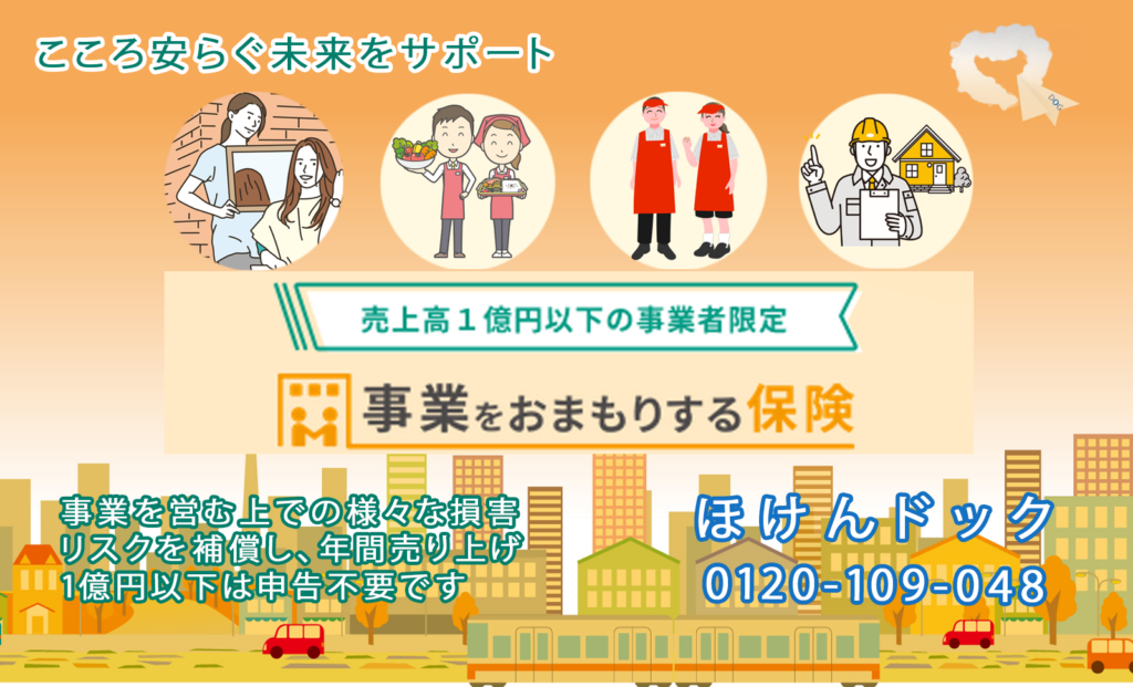 - これから事業を始めよう、お店を開こうと意気揚々と待ち受けている事でしょう。 こんなはずでは! 経営をしていく上で避けられない普段では気づかない様々な損害リスクを補償しますので是非加入をおすすめします。